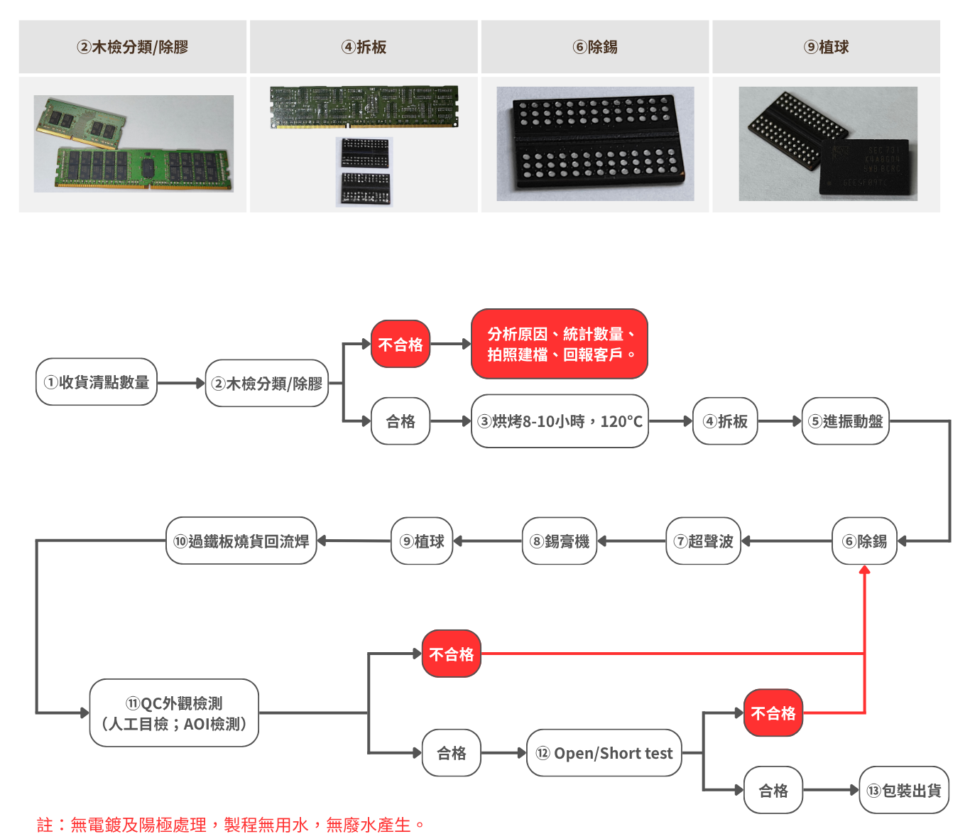 專業加工流程:涵蓋拆解焊、植球、以及嚴謹的檢驗測試服務。